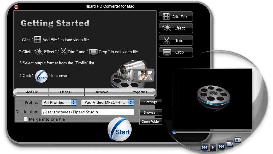 Tipard HD Converter for Mac provides the flexibility to optimize your video/audio effect, like joining videos, trimming a clip of video, cropping video, and adjusting video effect (Contrast, Brightness, Saturation, Deinterlaing, Volume) for corresponding with your players and so on.